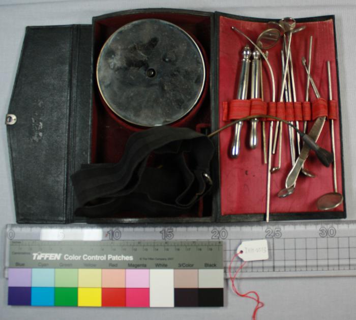 Appareil ORL, avec miroirs frontal et pharyngiens + pinceaux pour appliquer l’anesthésiant localement. Les instruments plus longs et courbés sont probablement des instruments nasaux. Plus récent que l’objet suivant (IHM-0514)