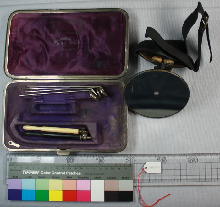 Appareil ORL, avec miroirs frontaux et pharyngiens. Manche d’instrument en corne, donc pré-asepsie . Autour de 1840-1850