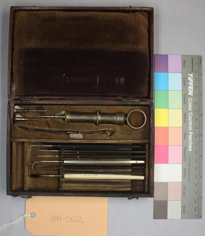 Coffret contenant une seringue avec 4 embouts supplémentaires, et 6 instruments d’ophtalmologie. Le donateur estimait que la seringue pourrait dater du XVI siècle. Les recherches effectués indiquent pourtant plutôt la datation bien plus tardive (XVIII ou XIX siècle). Par ailleurs, les autres instruments semblent plus récents.