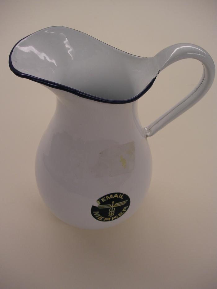 Pot à eau émaillé, blanc bordé de bleu, avec anse, capacité de 2,5lt. L’autocollant de la marque est collé sur l’un des côtés du pot.