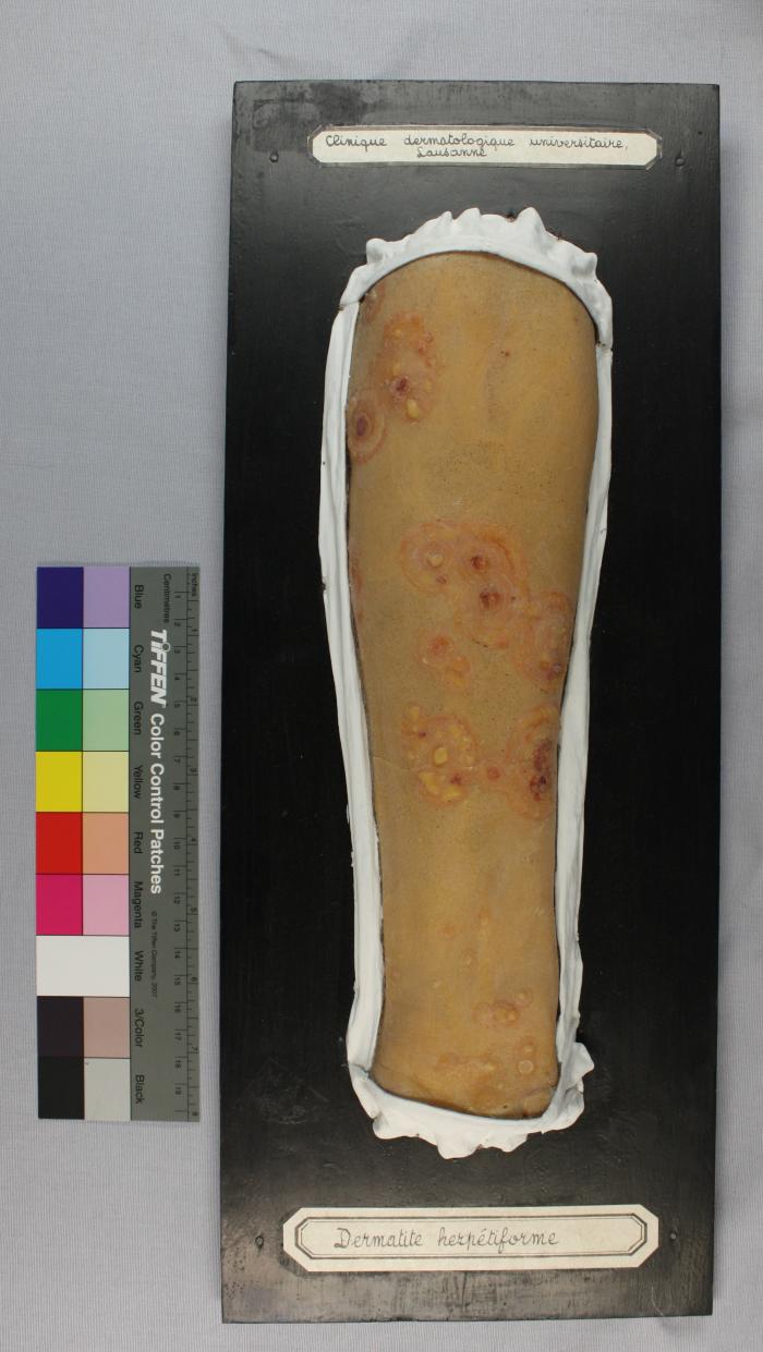 Cire dermatologique (moulage) sur bois peint en noir. 2 étiquettes (CDUL et titre). Au verso: diverses inscriptions (1760; 17)