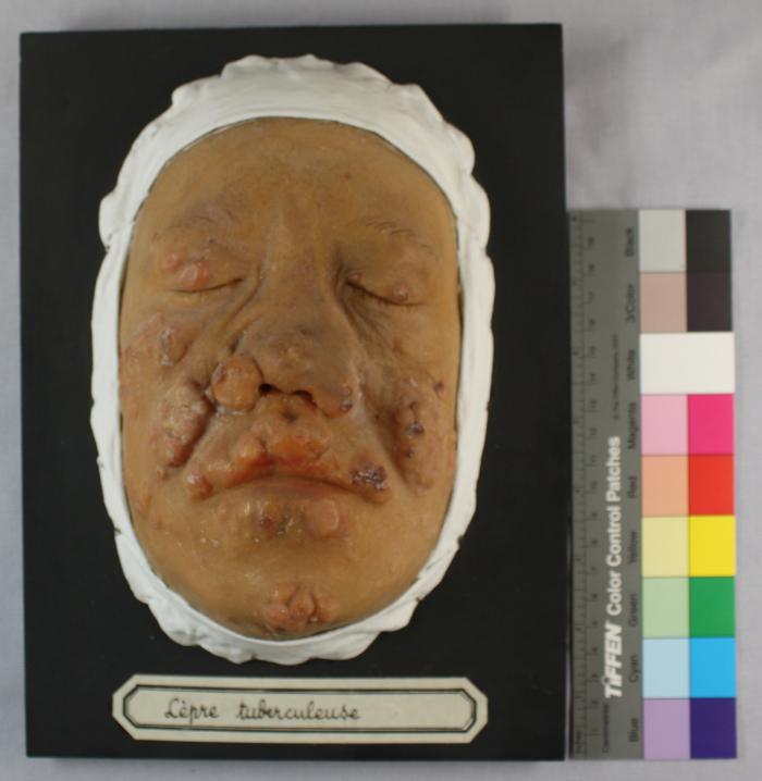 Cire dermatologique (moulage) sur bois peint en noir. verso: 881 / 132 lèpre tuberculeuse