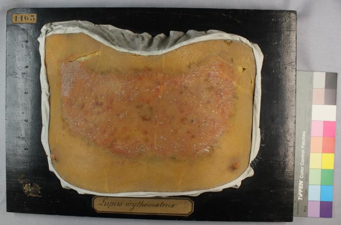 Cire dermatologique (moulage) sur bois peint en noir. 2 étiquettes (titre; N° 1163). signature J Baretta Paris Verso: Lupus; H; 1163; 65