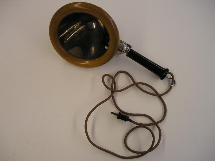 Lampe baladeuse en métal cerclée de bois clair, manche en bois noir.