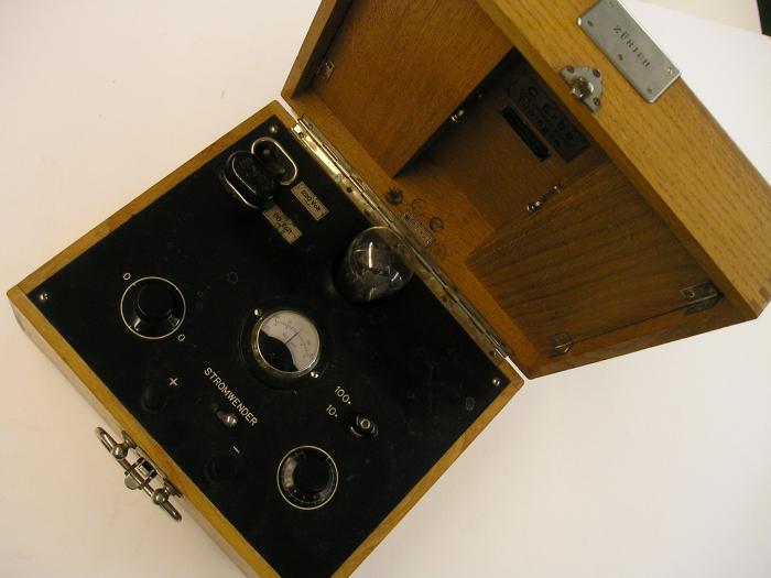Appareil d’électrothérapie, générateur haute fréquence avec accessoires, dans caissette de bois brun.