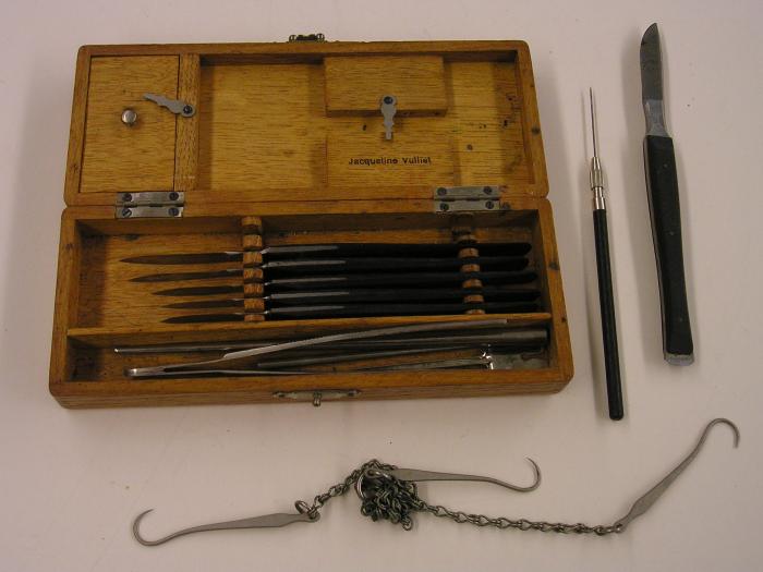 Caissette de bois brun clair contenant. - 6 scalpels de différentes tailles avec manche d’ébène - 1 pincette chirurgicale - 1 érigne à trois chaînes - 1 sonde cannelée - 3 sondes - 1 aiguille courbe dans petit compartiment