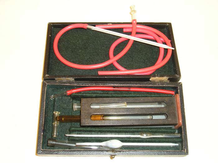 Hémomètre à socle rouge avec 3 pipettes et tuyaux de caoutchouc rouge dans étui noir gainé de feutrine vert foncée.