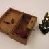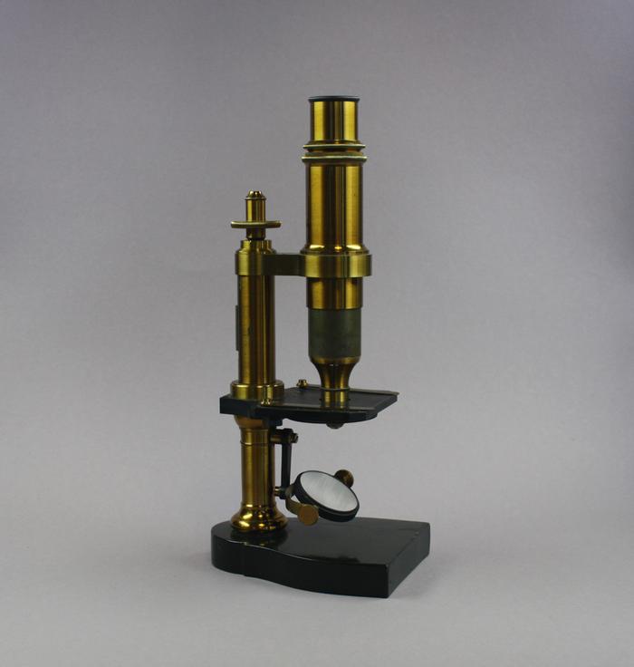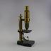 Microscope de laiton, pied de fonte avec: - 1 objectif - 1 oculaire - 1 petit objectif dans boîte noire gainée de rouge (manque 2 éléments) - lames carrées et rectangulaires dans un coffret de bois tâché.