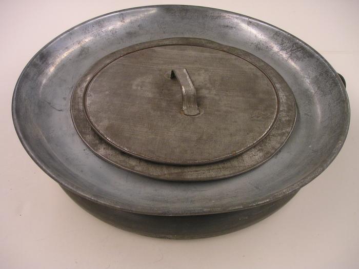 Bassin de lit avec poignée et couvercle, en zinc. contient 4 pièces différentes (bac, 2 cadres, un couvercle)