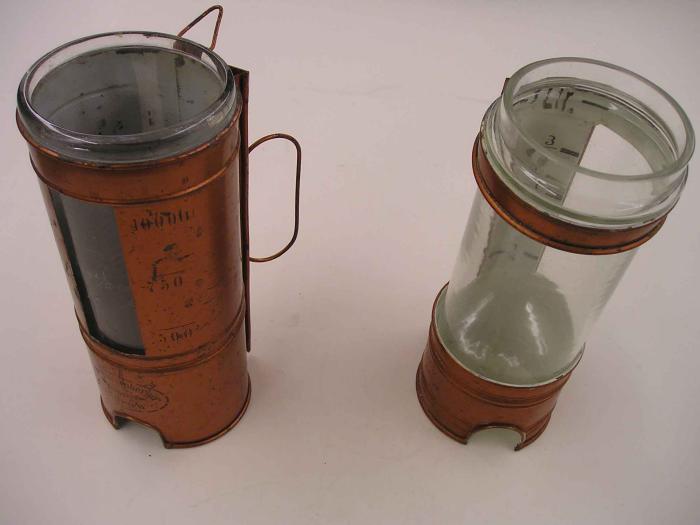 Broc à lavement en verre dans support en métal cuivré avec anse, gradué de 500 ml à 1L.