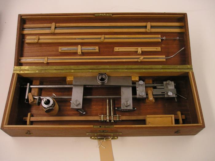 Appareil de visée pour le repérage des corps étrangers dans l’organisme, mis au point par le Prof. Jean-Charles Scholder en 1940. L’appareil de mesure et ses aiguilles sont contenus dans une caissette de bois clair de 60 cm x 21,5 cm x 11,5 cm.