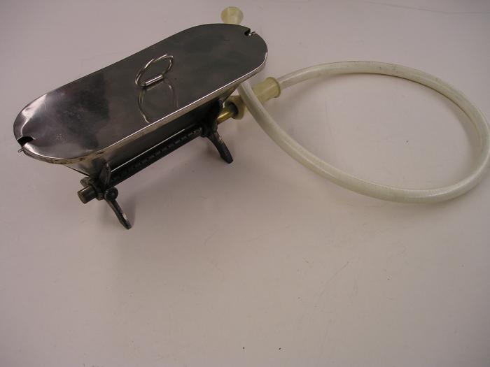 Stérilisateur à gaz en forme de “baignoire” avec tube d’alimentation et cordon de caoutchouc.