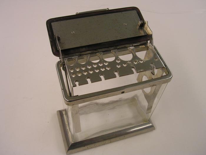 Récipient rectangulaire en verre avec socle, couvercle métal et support interne en métal pour les seringues et les aiguilles