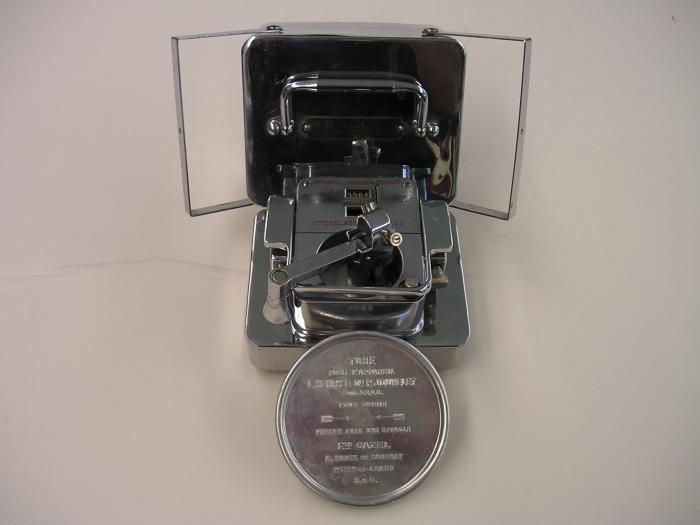 Appareil portatif en métal comprenant un socle avec dispositif pour comprimer le tuyau de caoutchouc et une manivelle pour faire avancer le sang, compteur en cc, avec couvercle de métal. Accessoires: - 2 aiguilles dans boîte de métal ronde - 1 tuyau de caoutchouc de 185 cm dans boîte de plastique - 1 mode d’emploi