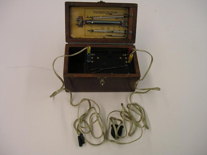 Thermocautère électrique à courant alternatif avec ses accessoires, dans caissette de bois brun