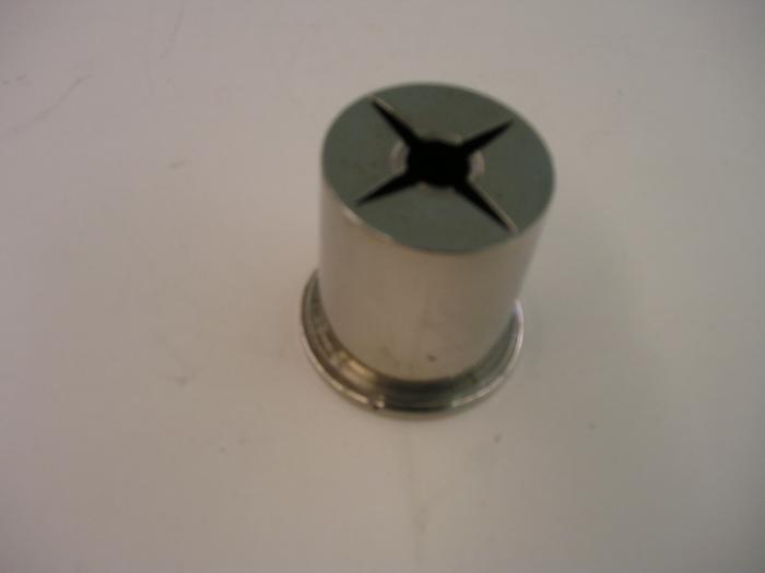 Cylindre de métal avec fond et couvercle découpé d’une croix.. ( Distributeur de coton? objet à identifier plus précisément).