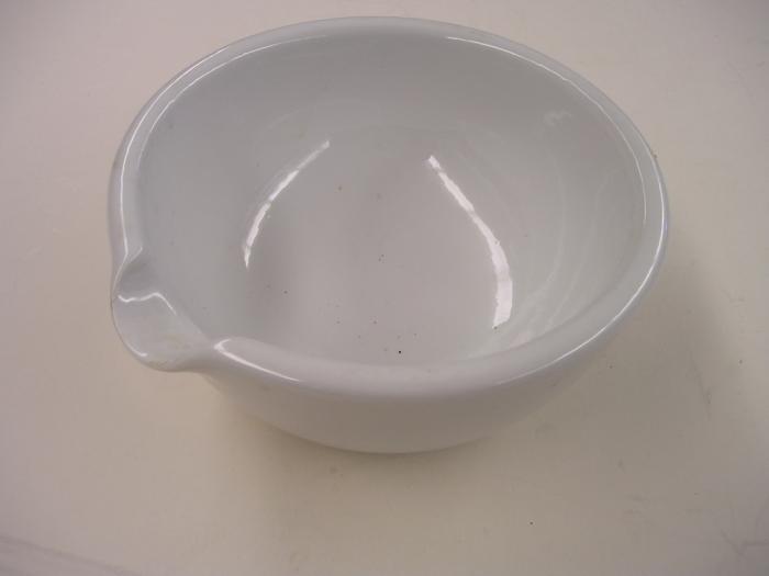 Mortier de porcelaine blanche utilisé en pharmacie pour piler les substances solides, (pas de pilon). (RF: est-on sûr de cette decription? le bec verseur indique plutôt un creuset, non? Sur les sites de pharma, on parle de capsule.)