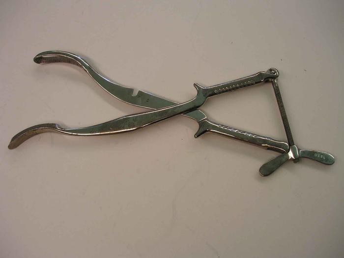 Cranioclaste de Gessner en métal nickelé appelé aussi céphalotribe, instrument servant à réduire la tête du foetus.