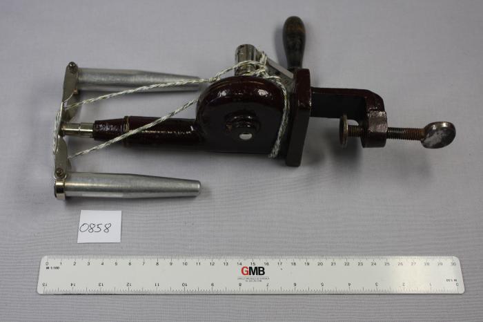 Centrifugeuse manuelle en fonte peinte en rouge, avec support pour 2 éprouvettes en fer blanc.