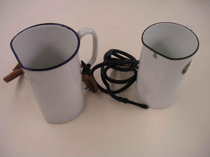 Broc à lavement en émail blanc avec bordure bleue.
