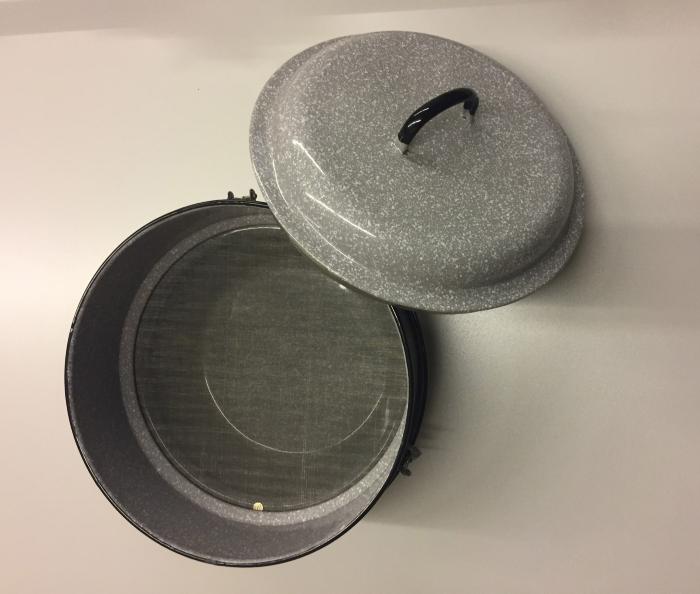 Tamis de laboratoire, en trois parties, avec couvercle et 11 grilles différentes.