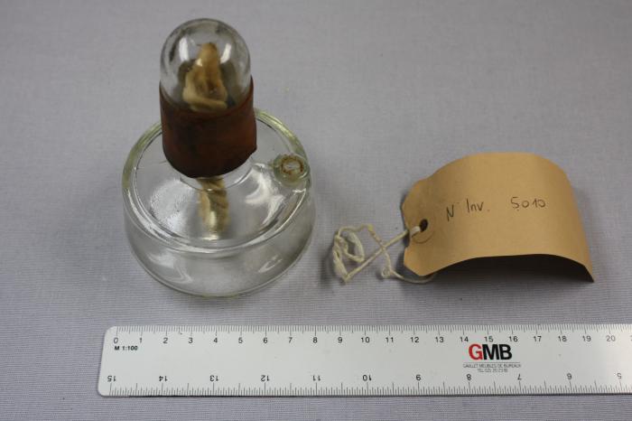 En verre blanc avec couvercle et mèche. Pour chauffer les instruments, notamment le miroir laryngien.