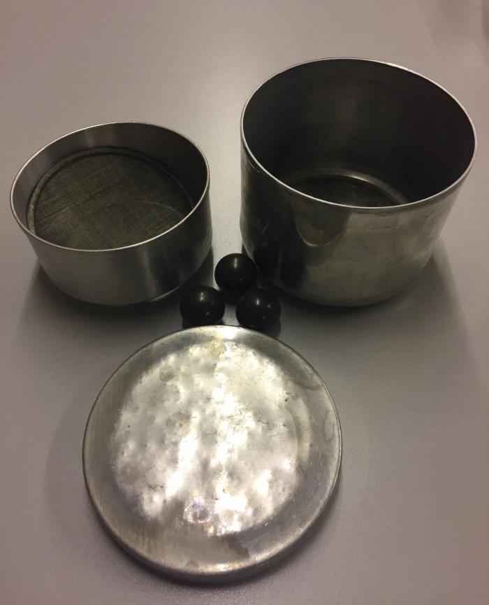 Tamis permettant de standardiser la granulométrie d'une poudre. Avec deux grilles, et trois billes.