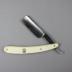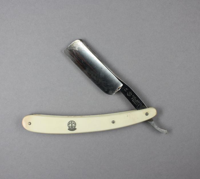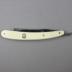 Rasoir coupe-chou en plastique blanc avec logo de la marque Rader (une ancre et deux drapeaux). La lame est légèrement oxydée et on peut y lire l'inscription 14 Carl Rader Solingen Germany avec le logo de la marque.