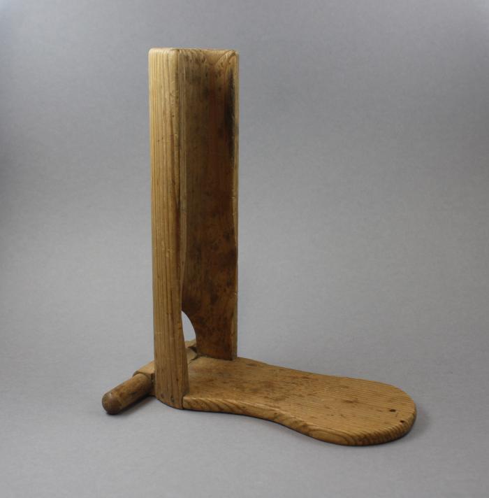 Gouttière en bois pour pied d’enfant constituée d'une planche de bois découpée à la forme du pied et d'un demi-cylindre adapté au mollet.