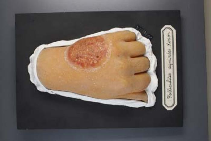 Cire dermatologique (moulage) sur planche de bois peinte en noir. Une étiquette manuscrite (titre). Signature de J Baretta. verso: 2 listes de bois et un crochet en métal. inscriptions: “G 217/968. Folliculites agaminées. Kérion. cf page 185. Dermatite main. 967. 49. 50 [biffé]” décoloration autour des clous.