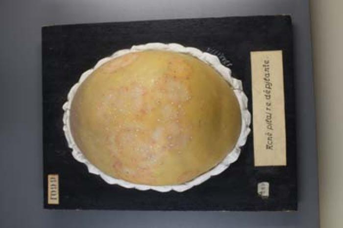 Cire dermatologique (moulage) sur planche en bois peinte en noir. 3 étiquettes (titre; 1099; 209); signature J Baretta Verso: décoloration au niveau des clous, 2 listes et crochet en métal, inscription: 70