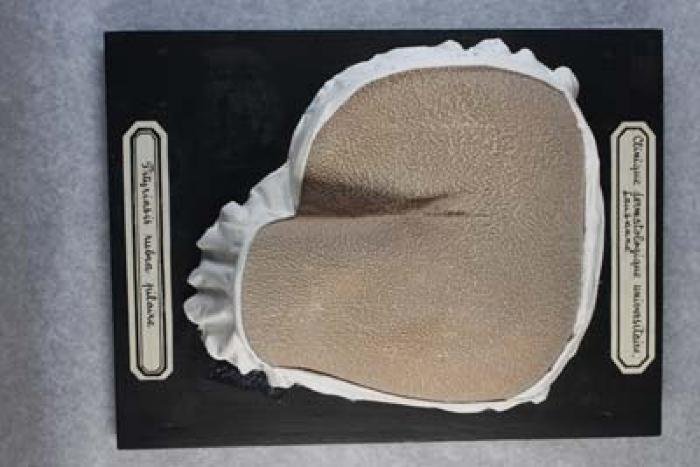 Cire dermatologique (moulage) sur planche de bois peinte en noir. 2 étiquettes (CDUL + titre) signature J Baretta verso: listes et crochet; 6, pityriasis rubra pilaire; lichen scro (?)