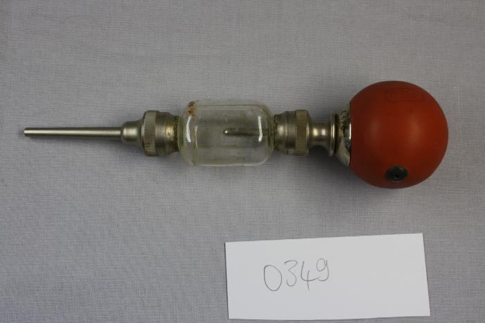 Lance poudre à réservoir en verre, inscription sur la pompe en caoutchouc “russka” probablement pour poudre iodoforme