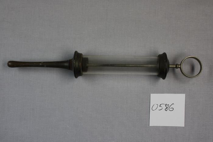 Seringue en métal avec réservoir en verre et pompe. Embout en forme de tétine.