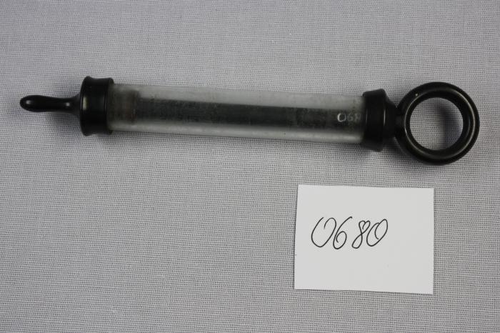 Petite seringue en bakélite avec réservoir et pompe. Embout en forme de tétine.