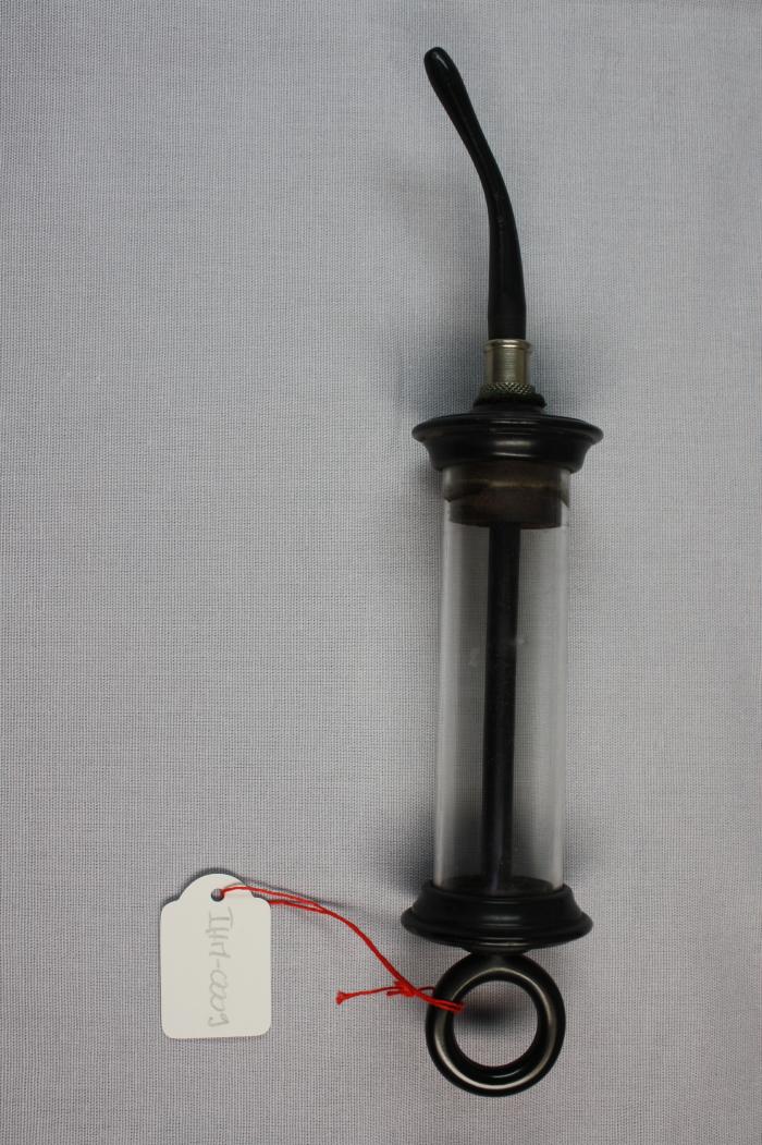 Seringue en bakélite avec réservoir en verre et pompe. Embout long et courbé.
