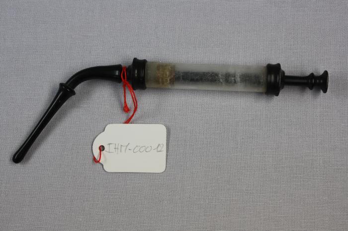 Petite seringue en bakélite avec réservoir en verre et pompe à manche plat. Embout long et courbé. Dans lot “270 Morier-Genout” (cf. Bordereau de versement, 23 mai 1996)