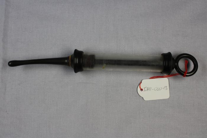 Seringue en bakélite avec réservoir en verre et pompe. Embout long et courbé. Dans lot “270 Morier-Genout” (cf. Bordereau de versement, 23 mai 1996)
