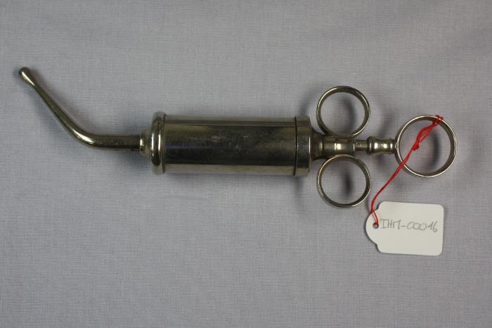 Seringue en métal. Pompe graduée et marquée d’un insigne (fabricant), avec trois anneaux pour les doigts. Embout long et courbé.