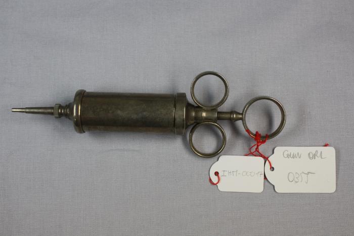Seringue en métal. Pompe graduée et marquée d’un insigne (fabricant), avec trois anneaux pour les doigts. Embout droit. Dans lot “CHUV ORL 0355”