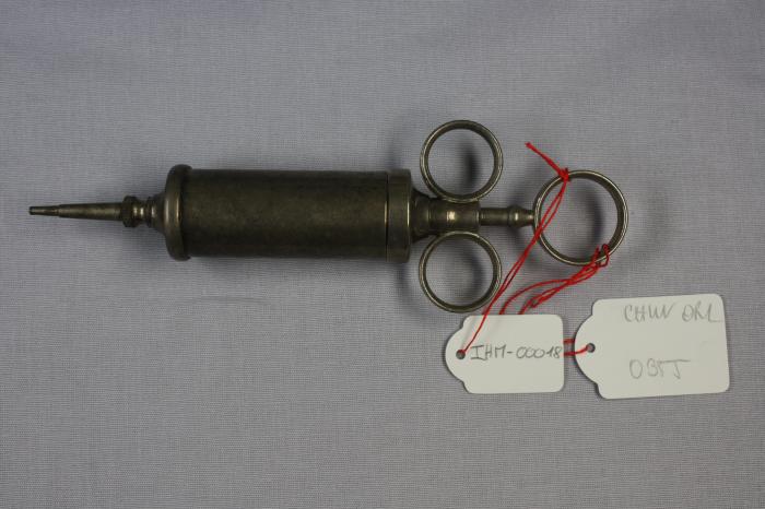 Seringue en métal. Pompe graduée et marquée d’un insigne (fabricant), avec trois anneaux pour les doigts. Embout droit. Dans lot “CHUV ORL 0355”