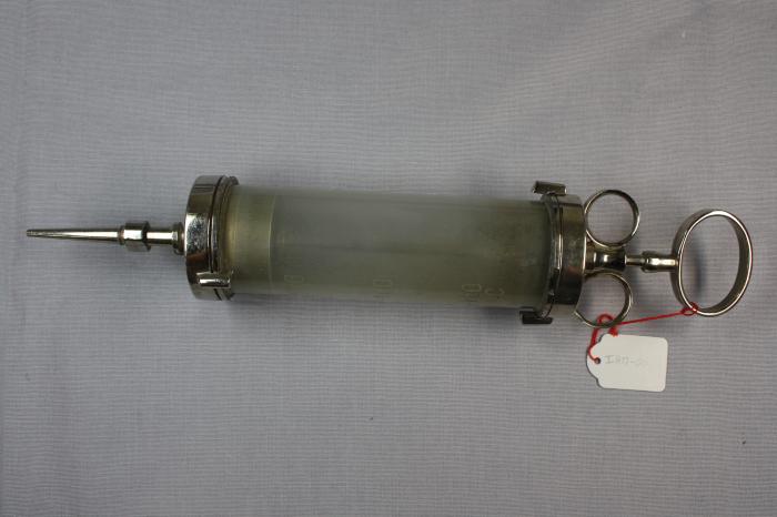 Seringue en métal. Réservoir gradué en verre avec petit insigne (fabricant?). Pompe et trois anneaux pour les doigts (deux petits, un grand). Embout droit bagué à la base.