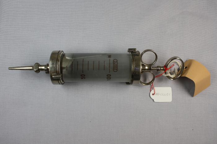 Seringue en métal. Réservoir gradué en verre. Pompe. Trois anneaux pour les doigts. Embout droit de tétine bagué à la base.