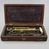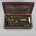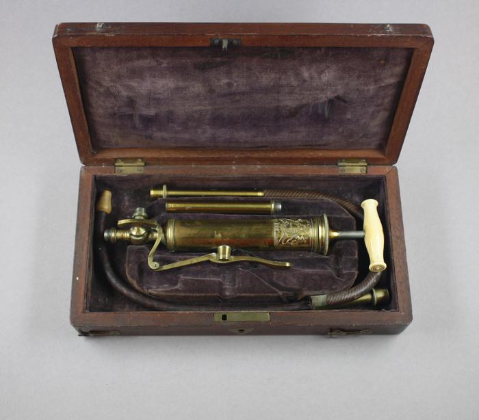Seringue métallique doreé (laiton?), manche en ivoire. 2 joints. 2 tuyaux. Dans un étui en bois et velours. Inscription “Warranted Improved patent Syringe. London made” avec écusson.