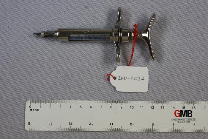 Petite seringue en métal avec insigne (fabricant). Réservoir gradué en verre avec inscription “swiss made”.