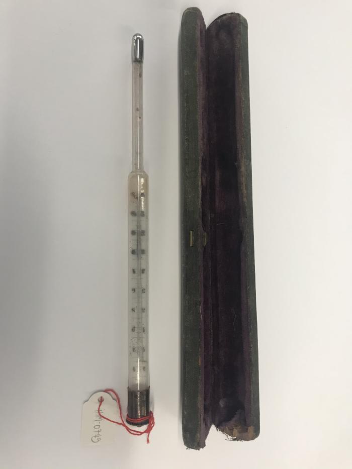 Thermomètre gradué de 26 à 44°C dans un étui noir gainé de velours violet, marqué “O.Richter” St-Petersburg.