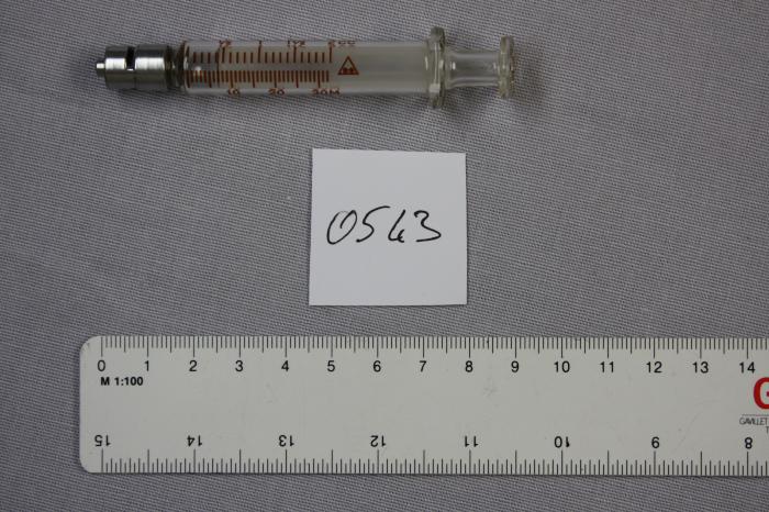 Seringue en verre graduée. Inscriptions “B-D”, “Multifit”, “made in France”. Embout en métal.