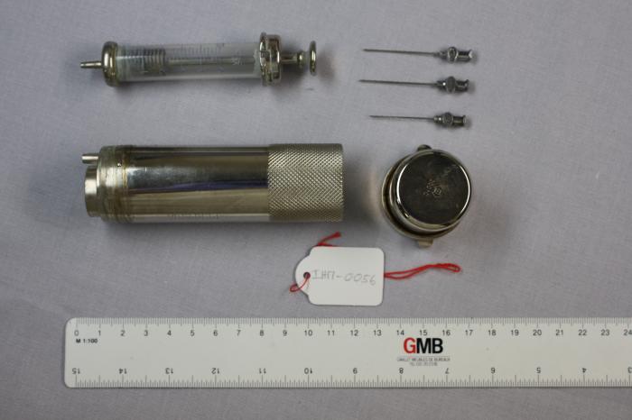 Seringue en métal avec réservoir en verre. 3 aiguilles en métal. Etui en métal avec inscription “PERPETUA”