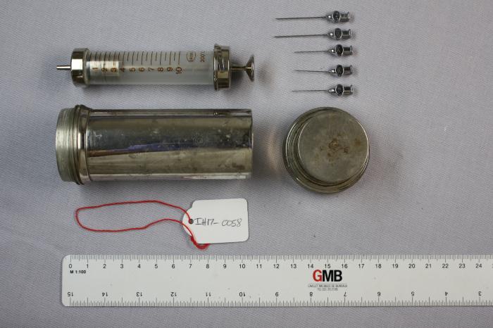 Seringue en métal avec réservoir gradué en verre, fabricant “Socorex”. 5 aiguilles en métal. Etui en métal.