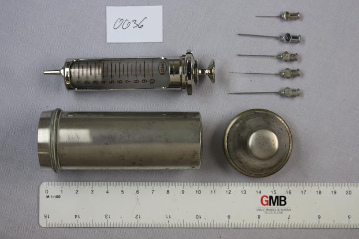 Seringue en métal avec réservoir gradué en verre, fabricant “Standard”. 5 aiguilles en métal. Etui en métal.